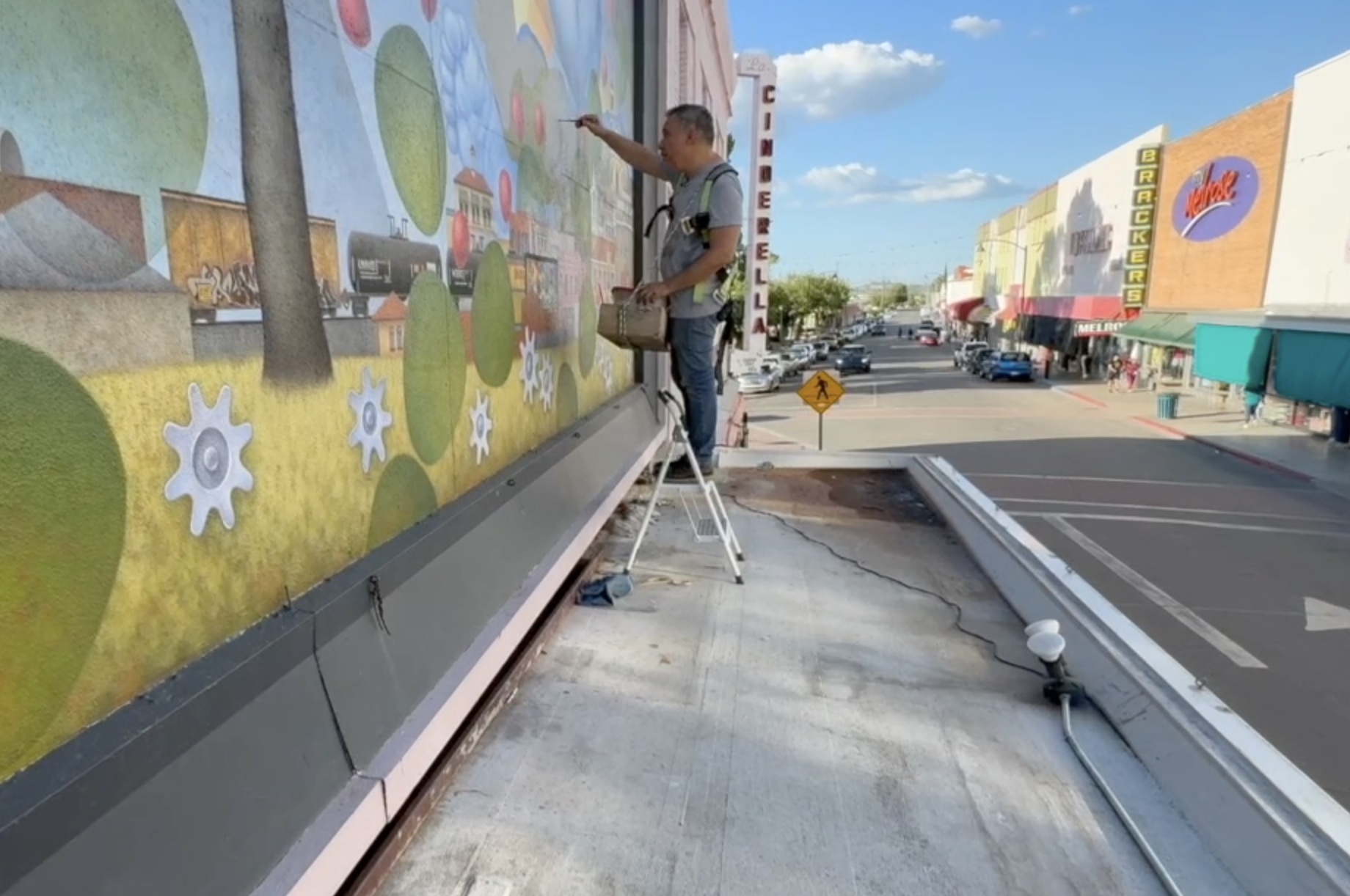 As artist Carlos Ibarra touches up his latest mural overlooking Morley Avenue, he explains the meaning of the painted Nogales cityscape which highlights twins and a heart in the middle.