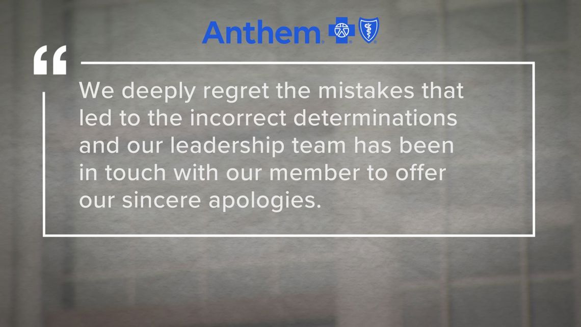 We deeply regret the mistakes that led to the incorrect determinations and our leadership has been in touch with our member to offer our sincere apologies. Anthem Blue Cross and Blue Shield is committed to ensuring our members receive timely and appropriate care. We take our responsibility to our members seriously and we are taking immediate steps to improve our processes to provide the high-quality service they deserve. These steps include a more personalized, proactive, and high-touch approach to addressing complex situations like this one.”