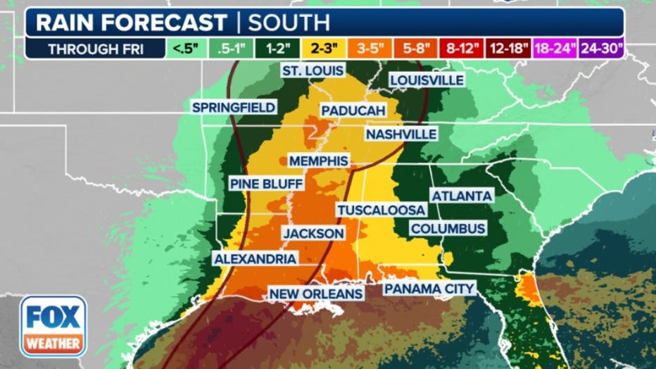 A look at the rain forecast in the South through Friday. (FOX Weather)