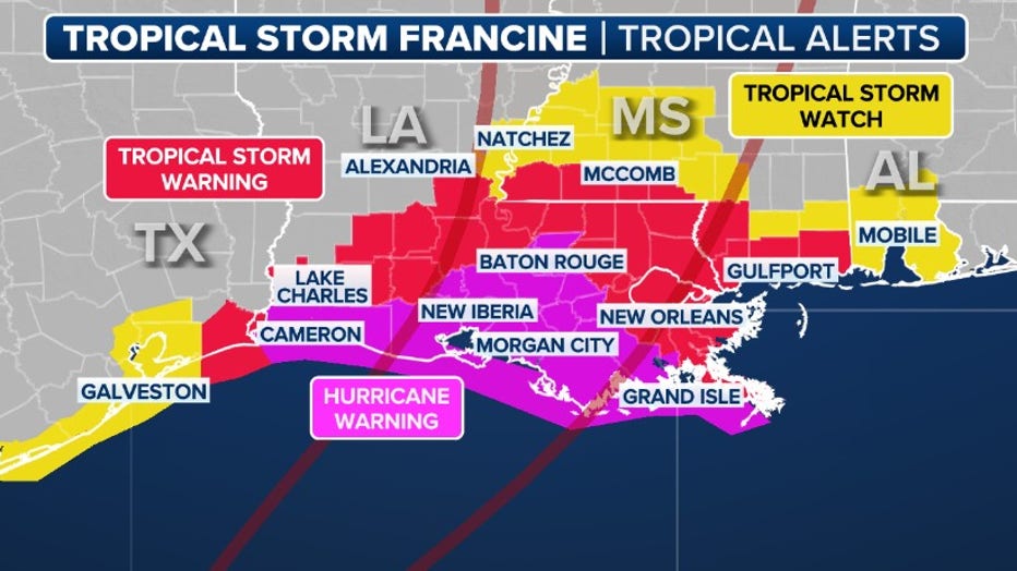 Watches and warnings for Tropical Storm Francine. (FOX Weather)