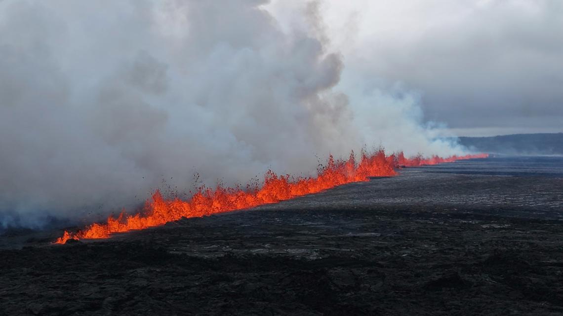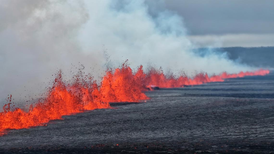 Lava from the eruption is flowing southeast from a fissure in the barren landscape that is at least 2,300 feet wide, but isn’t threatening any infrastructure.